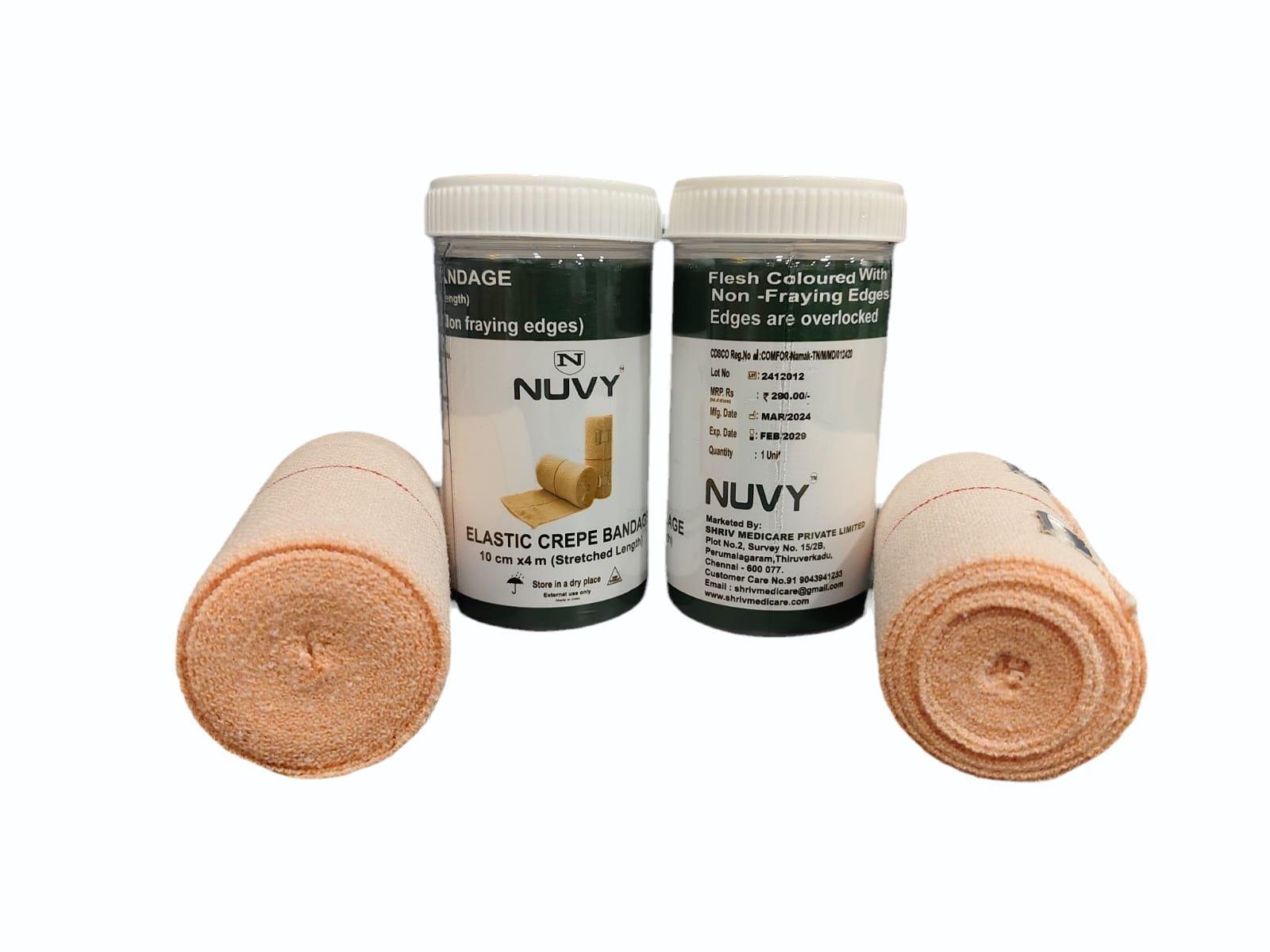 CREPE BANDAGE - SIZE - 8CMX4M Our Nuvy Cotton Elastic Crepe Bandage is a high-quality, soft, and supportive bandage designed for wrapping and securing injuries, wounds, and dressings. Made from a blend of cotton and elastic fibers, this bandage provides excellent flexibility and conformability, allowing for a comfortable and secure fit. The 15cmx4m size is ideal for wrapping and securing larger areas of the body. Usage: 1. Wrapping and securing injuries, wounds, and dressings 2. Providing support and stability to injured limbs and joints 3. Holding medical devices and equipment in place 4. Supporting and stabilizing surgical sites and wounds 5. Use in hospitals, clinics, and medical offices 6. Use by medical professionals, including nurses and doctors 7. Use for patients with injuries, wounds, or surgical sites Benefits: 1. Soft and gentle on skin, reducing the risk of irritation and discomfort 2. Supportive and stable, providing excellent support and stability to injured areas 3. Flexible and conformable, allowing for a comfortable and secure fit 4. Easy to apply and adjust 5. Cost-effective and efficient Key Features: 1. Made from a blend of cotton and elastic fibers 2. 15cmx4m size for wrapping and securing larger areas of the body 3. Soft and gentle on skin 4. Supportive and stable 5. Flexible and conformable Keywords: 1. Crepe bandage 2. Cotton elastic crepe bandage 3. Soft and supportive bandage 4. Medical bandage 5. Surgical bandage 6. Wound care bandage 7. Injury bandage 8. Supportive bandage 9. Flexible bandage 10. Conformable bandage